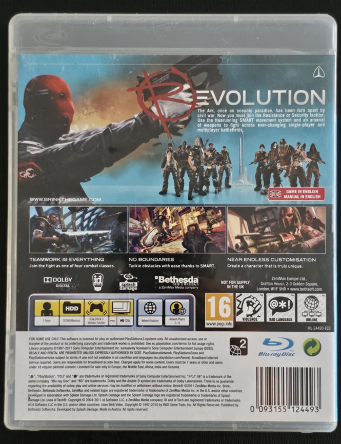 BRINK for PlayStation 3 is a team-based FPS that combines parkour movement, class-driven objectives, and customizable characters in a futuristic civil war on a floating city. Its SMART movement system made traversal exciting, and its focus on cooperation set it apart from traditional shooters. However, technical issues, repetitive gameplay, and weak AI limited its lasting appeal, though it still holds a cult following for its creativity.