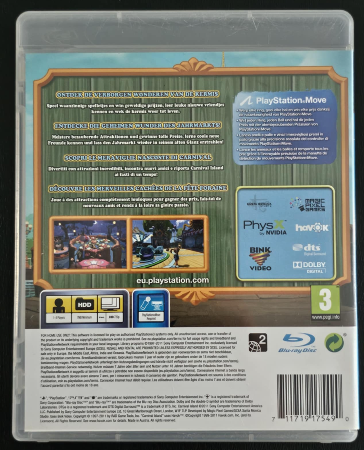 Carnival Island for PlayStation 3 is a family-friendly motion-controlled party game where players restore a magical carnival by competing in fun mini-games using the PlayStation Move controller. With over 35 activities, whimsical visuals, and a lighthearted atmosphere, it’s best enjoyed as a party or family game rather than a deep single-player experience.