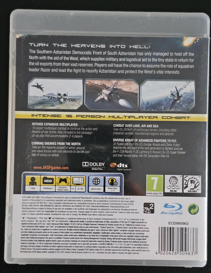 JASF: Jane’s Advanced Strike Fighters for PlayStation 3 is an arcade-style aerial combat game that offers fast dogfights, bombing runs, and co-op missions with a variety of modern jets. While it lacks the depth and polish of hardcore flight simulators or higher-budget titles like Ace Combat, it provided an accessible entry point into jet combat with fun, straightforward action and co-op play.