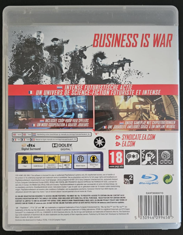 Syndicate for PlayStation 3 is a high-tech, adrenaline-fueled cyberpunk shooter set in a future ruled by corporations. You play as an enhanced agent using both firepower and hacking skills to dominate the battlefield.