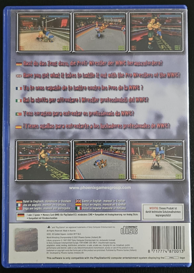 WWC: World Wrestling Championship for PlayStation 2 is a low-budget wrestling game built around a basic set of modes: exhibition, practice, and a championship challenge. With a starter roster of six characters and around thirty opponents, it delivers a stripped-down wrestling experience. Its strength lies in being accessible and simple, though at the cost of polish, depth, and refined mechanics.
